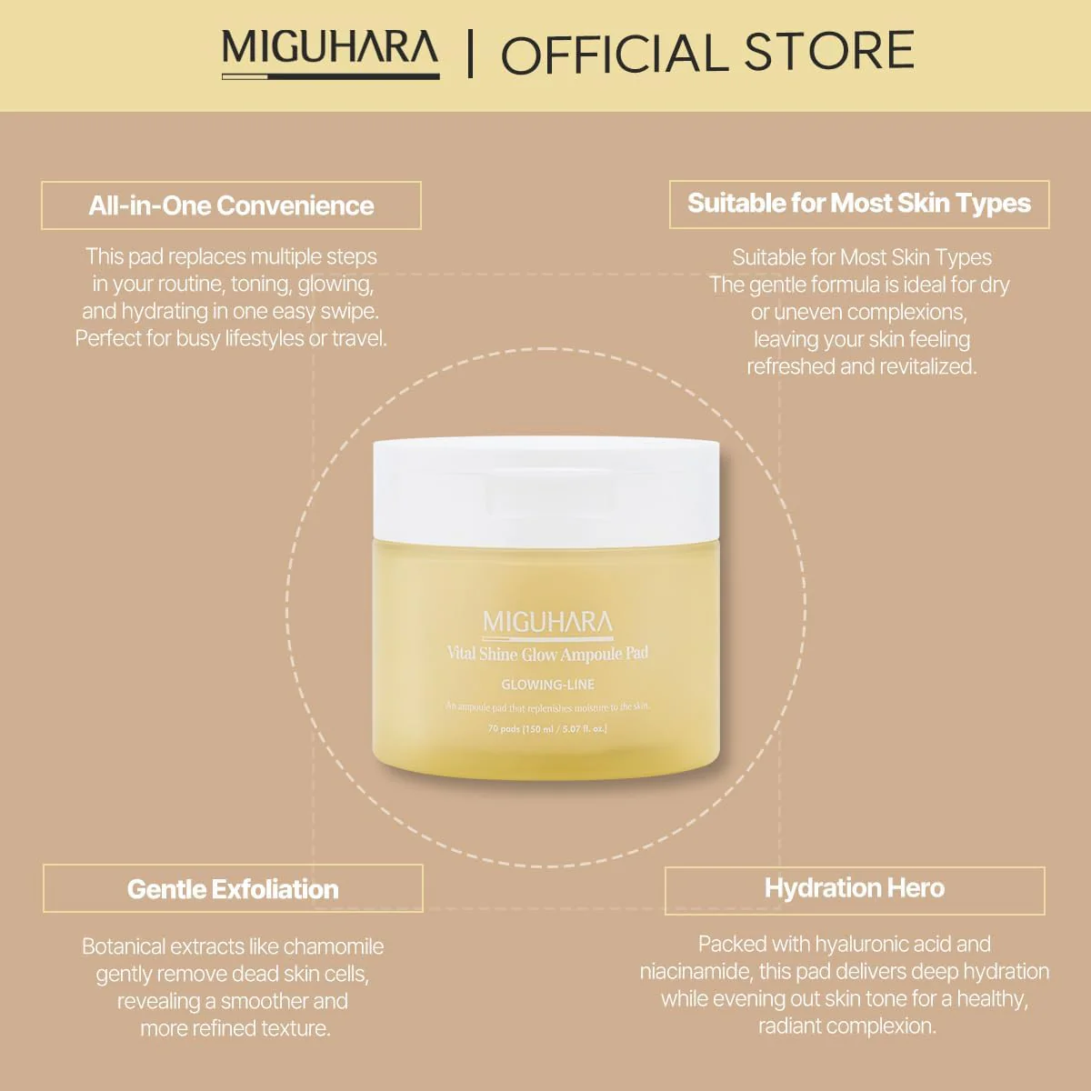 Miguhara Vital Shine Glow Ampoule Pad is an ampoule-infused toner pad designed for skin that looks dull or lacks radiance. The pads are soaked in a lightweight ampoule essence that focuses on enhancing skin glow while maintaining a comfortable, non-sticky finish suitable for regular use.